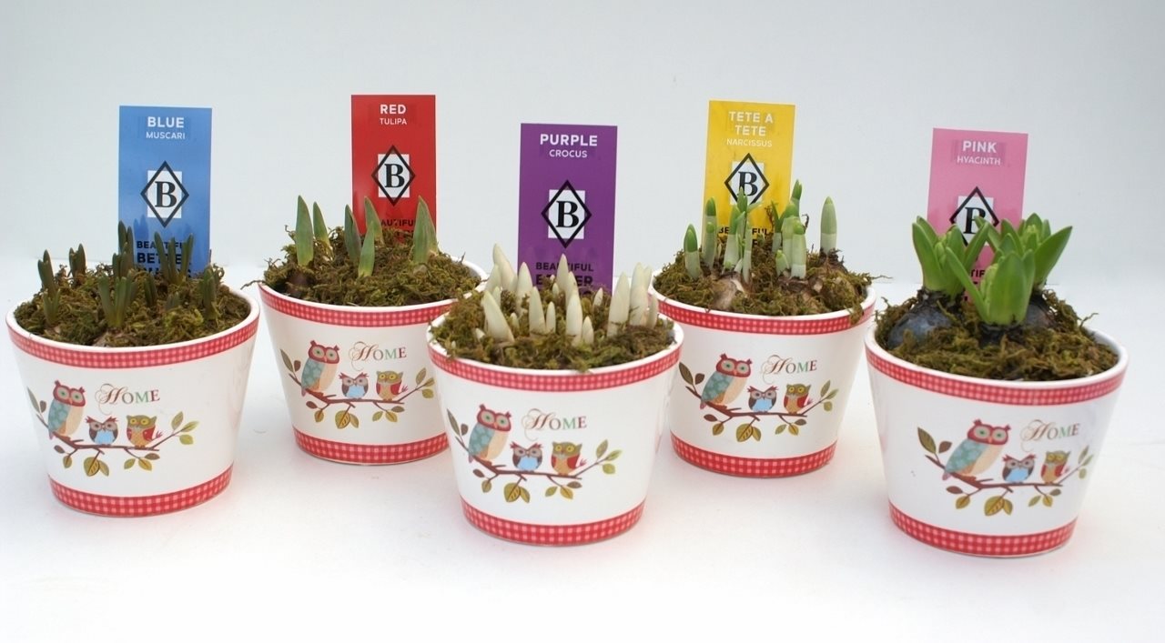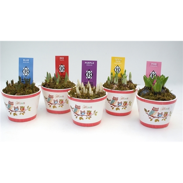 Bolbloemen div. soorten in keramiek met Uil design opgemaakt met mos (BMM 451)