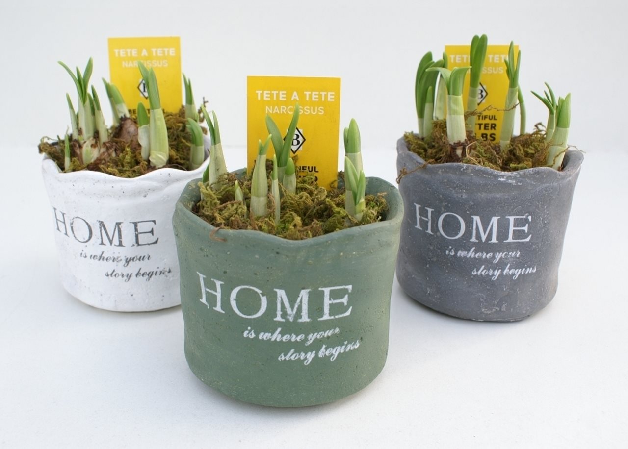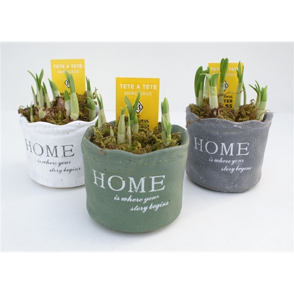 Narcissus Tête a tête in stenen home deco pot opgemaakt met mos (NTM 271)