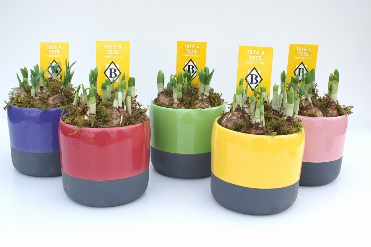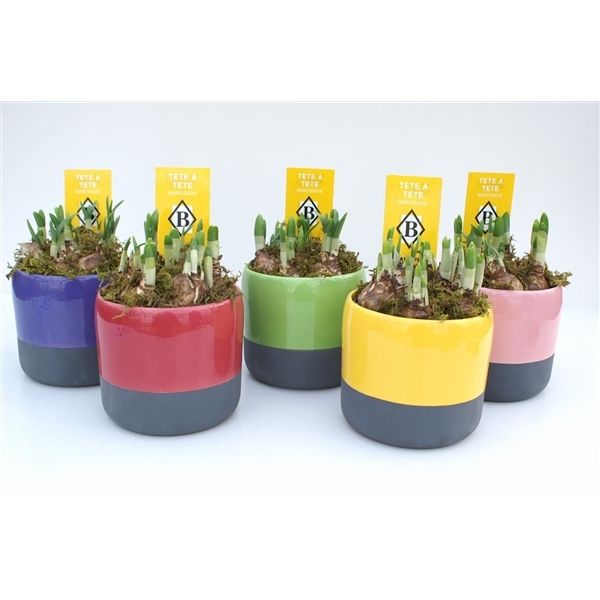Narcissus Tête a tête in gekleurde keramiek pot opgemaakt met mos. (NTM 551)