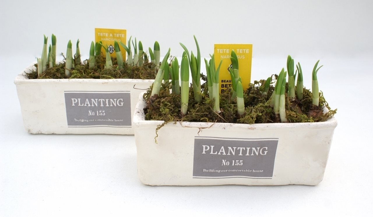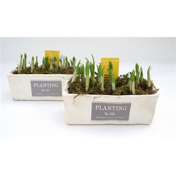 Narcissus Tête a tête in witte keramieke schaal met opdruk opgemaakt met mos (NTM 277)