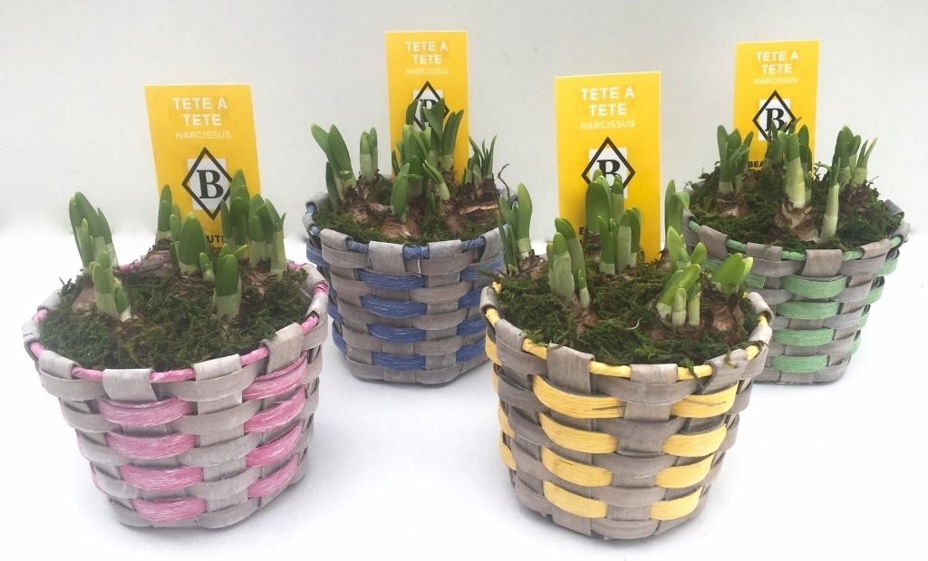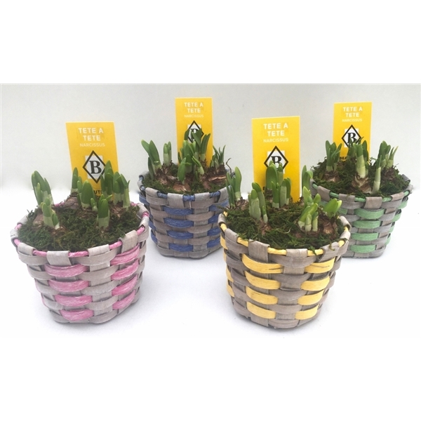 Narcissus Tête a tête in gevlochten mand opgemaakt met mos. (NTM 852)