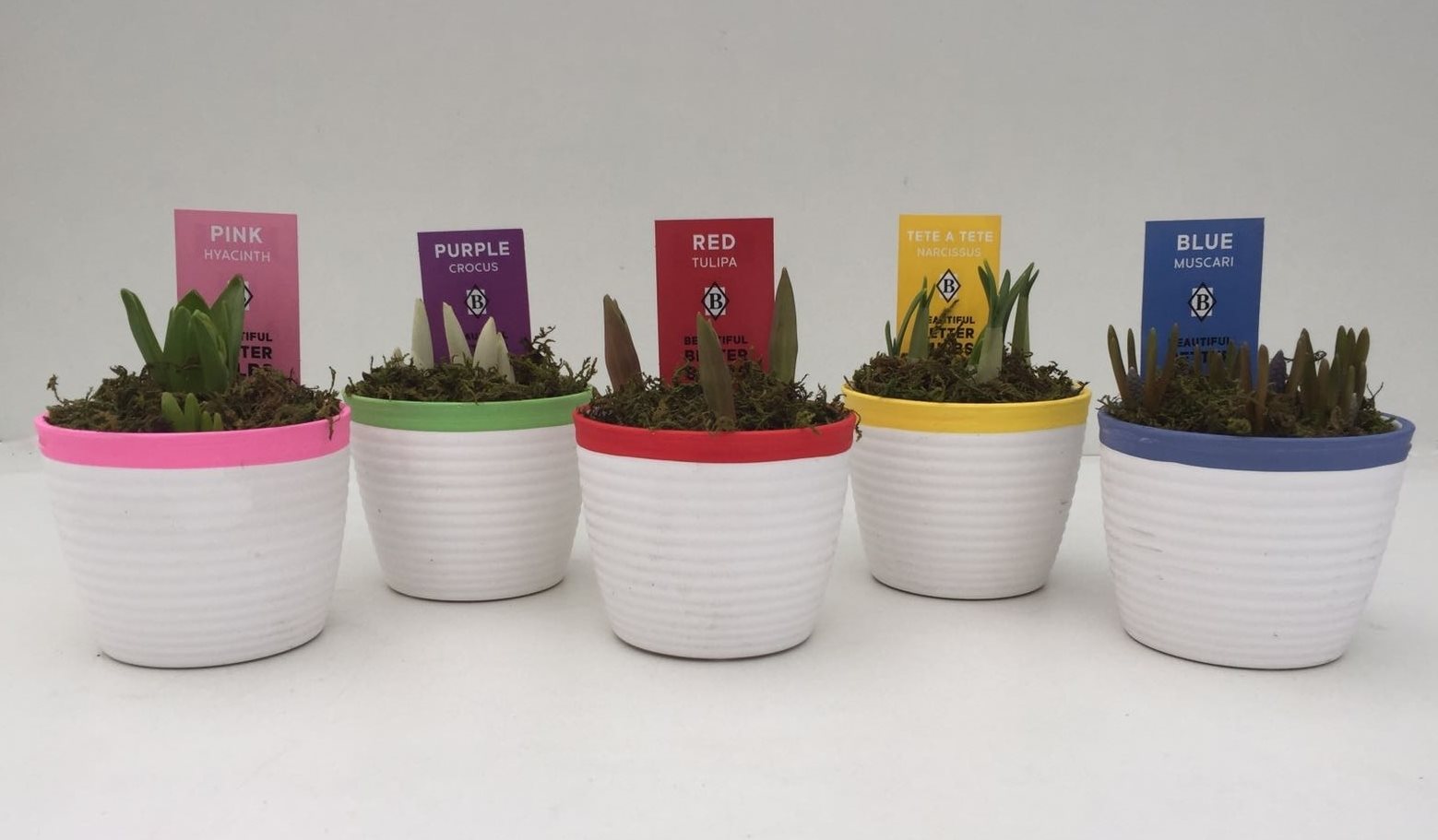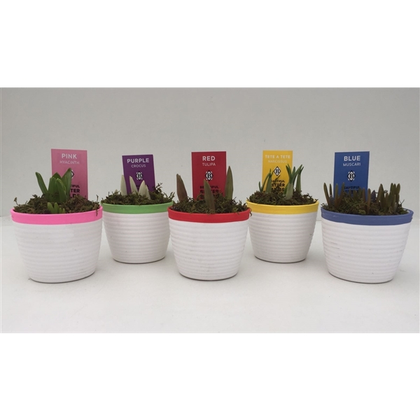 Bolbloemen div. soorten in witte keramieke pot met kleurrand opgemaakt met mos. (BMM 754)