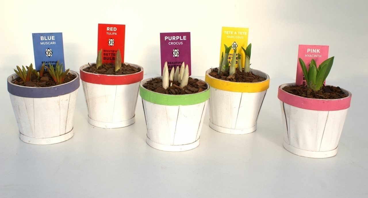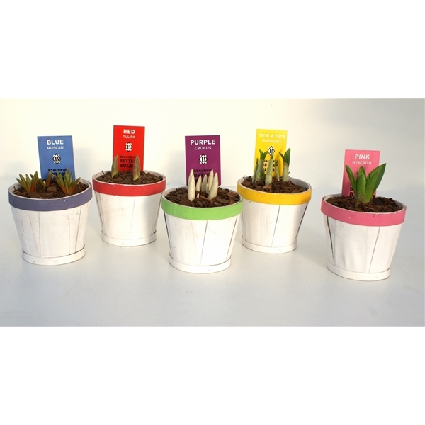 Bolbloemen div. soorten in witte houten pot met kleurrand. (BM 555)