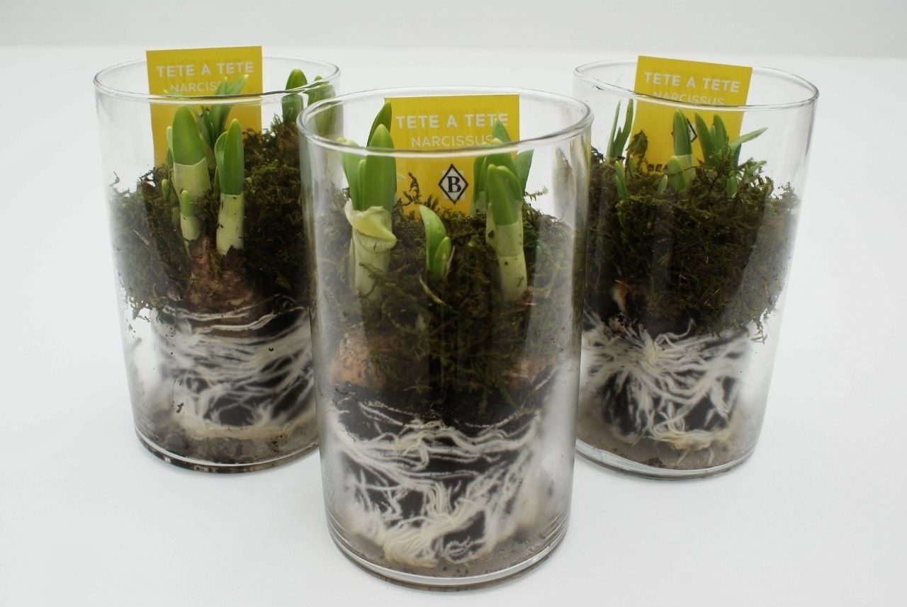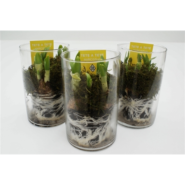 Narcissus Tête a tête in cilinderglas met opgemaakt mos (NTM 651)
