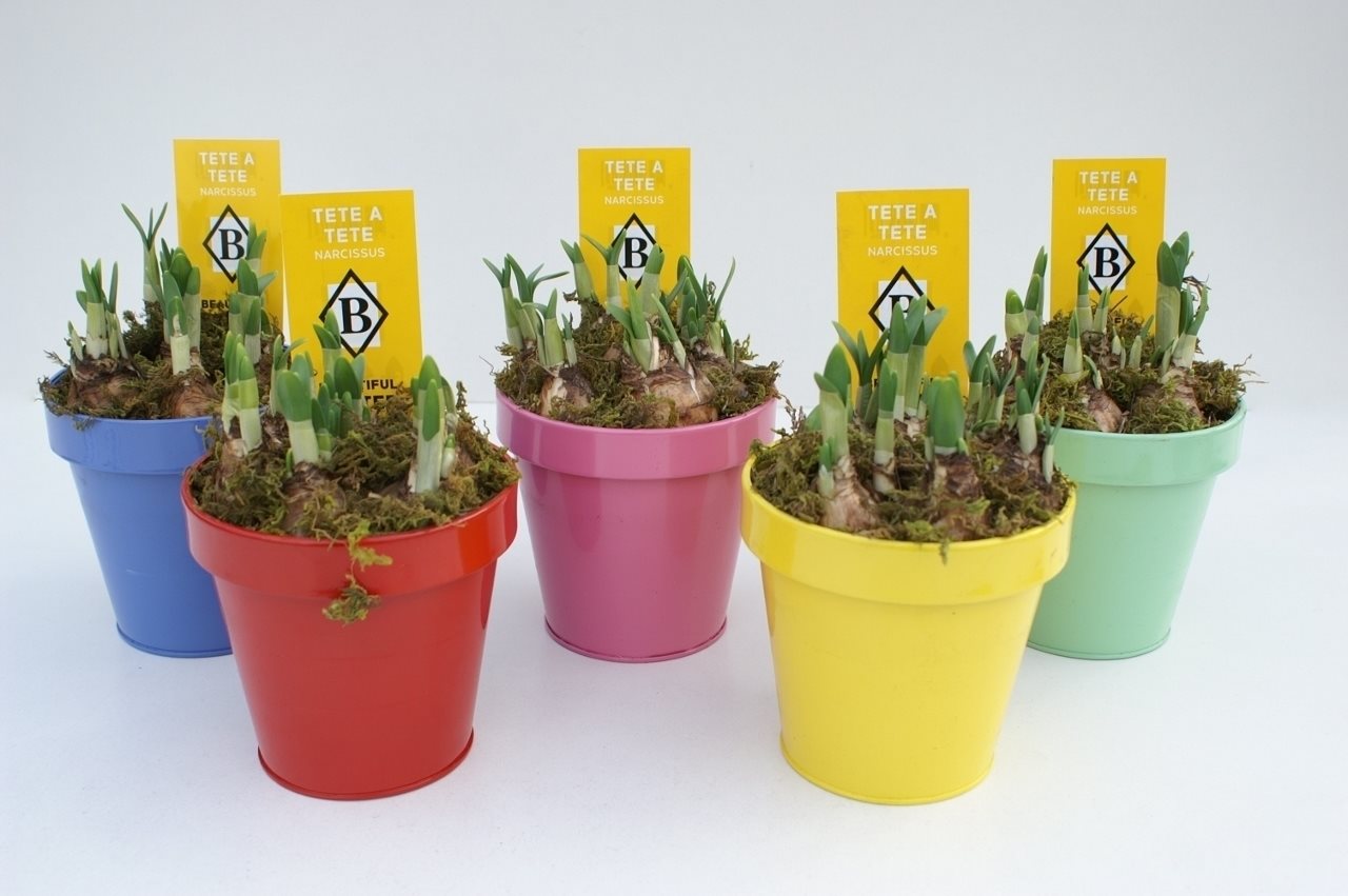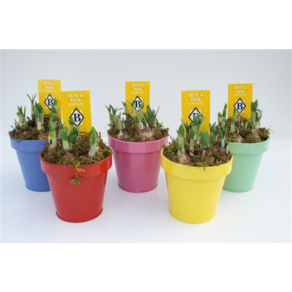 Narcissus Tête a tête in zinken kleurpot opgemaakt met mos (NTM 552)