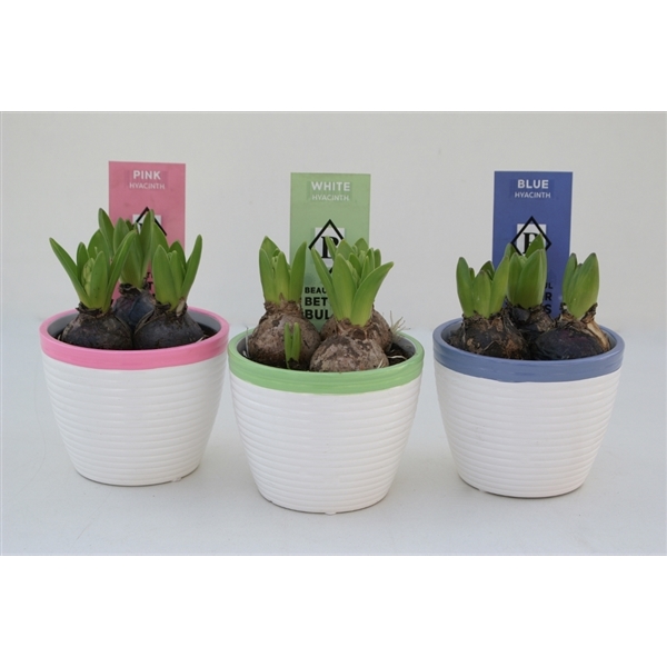 Hyacinthus div. kleuren in witte keramieke pot met kleurrand. (HM 755)