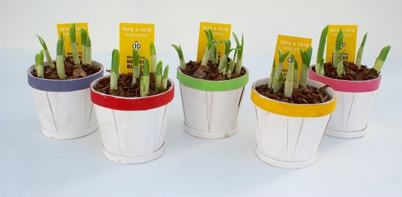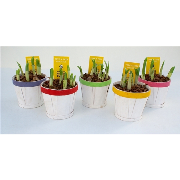 Narcissus Tête a tête in witte houten pot met kleurrand. (NT 555)