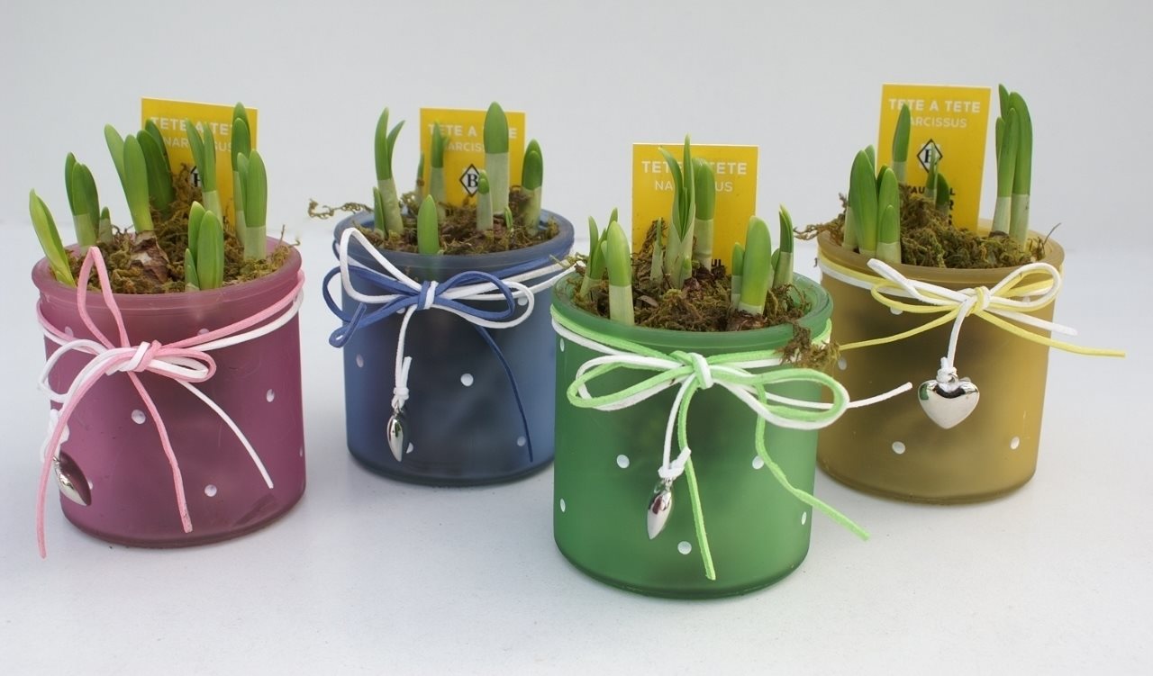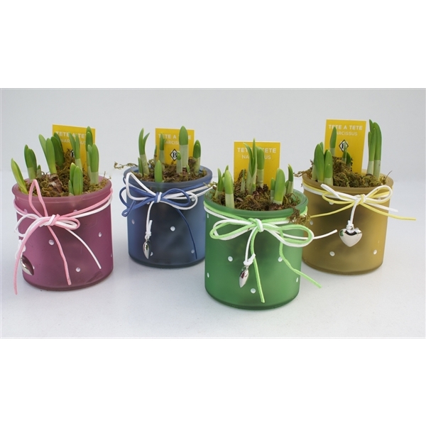 Narcissus Tête a tête in gekleurd glas met stippen en bedeltjes opgemaakt met mos (NTM 557)