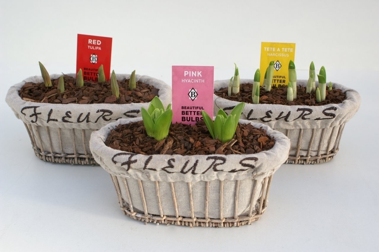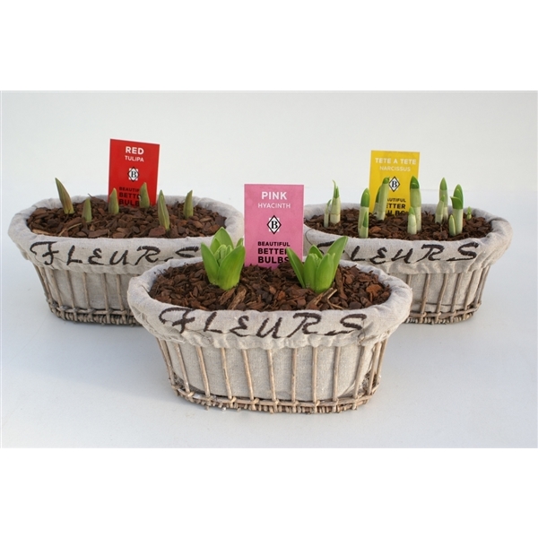Bolbloemen div. soorten in ovaal mand met jute (BM 260)