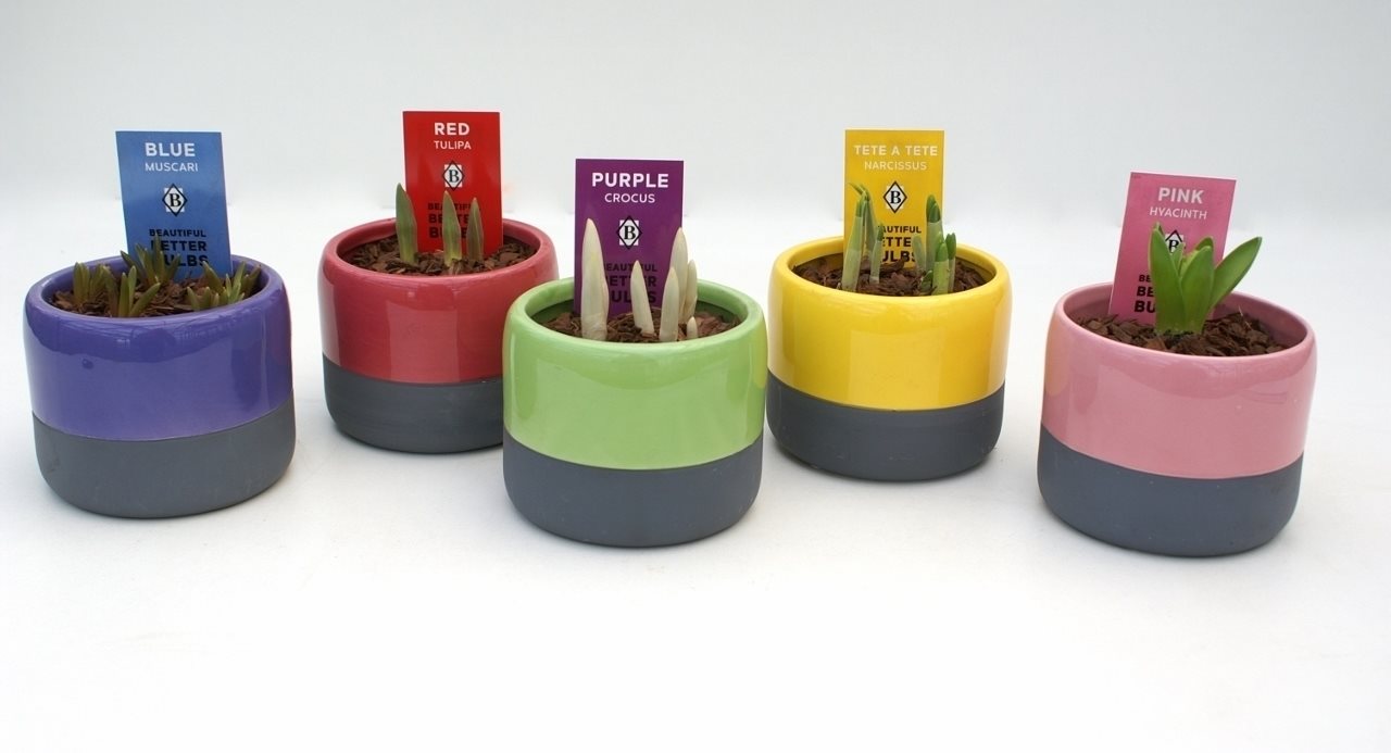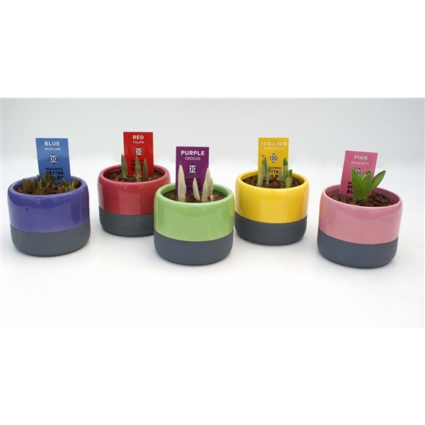 Bolbloemen div. soorten in gekleurde keramiek pot. (BM 558)