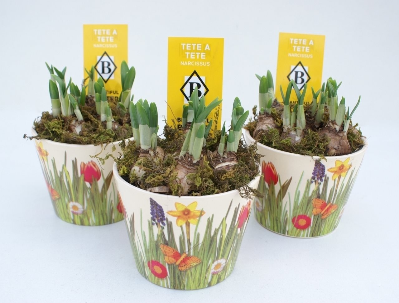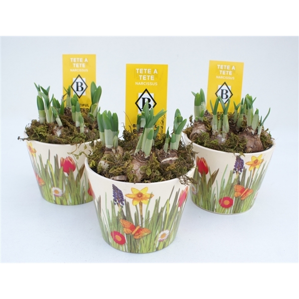 Narcissus Tête a tête in keramieke pot met voorjaarsdeco opgemaakt met mos (NTM 273)