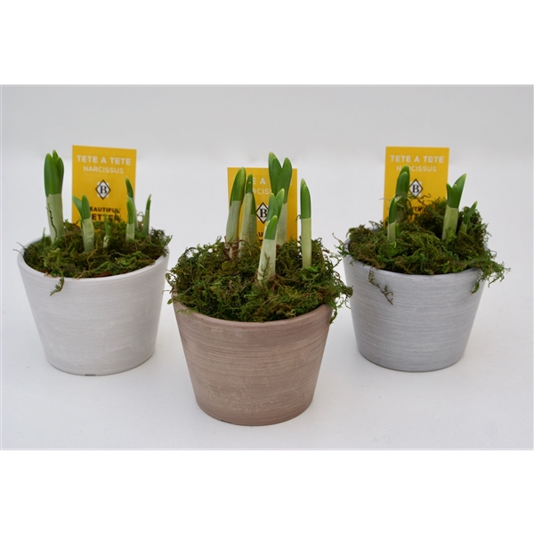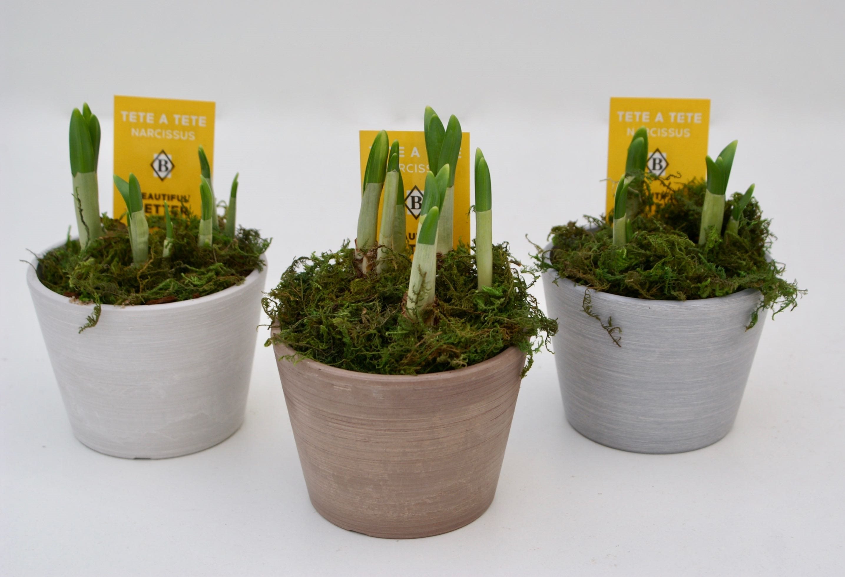 Narcissus Tête a tête in stone look pot opgemaakt met mos (NTM 952)