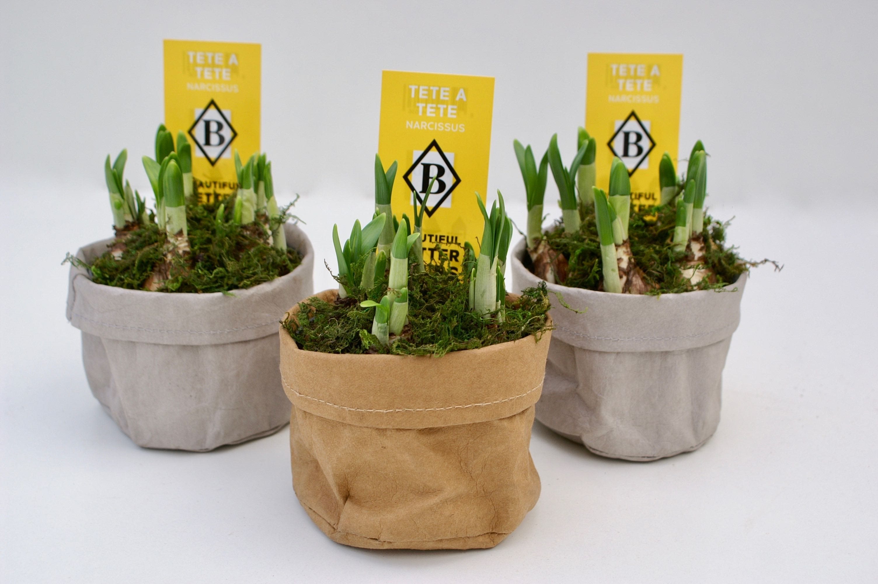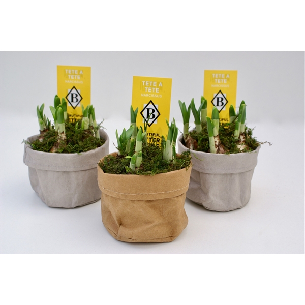 Narcissus Tête a tête in leather pot opgemaakt met mos (NTM 953)