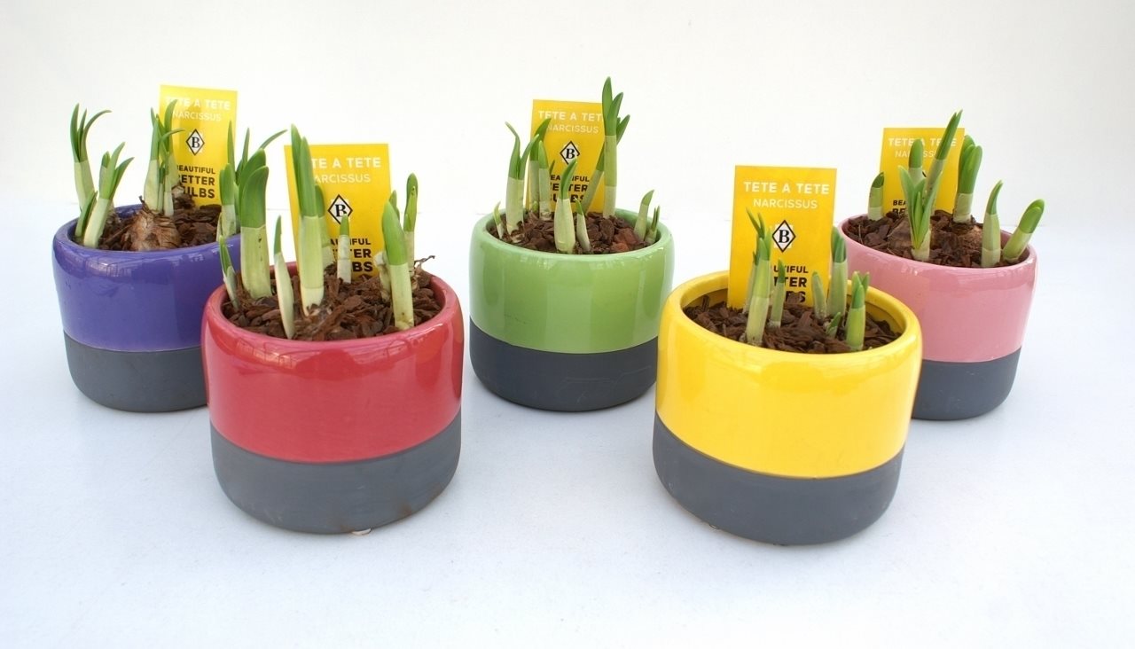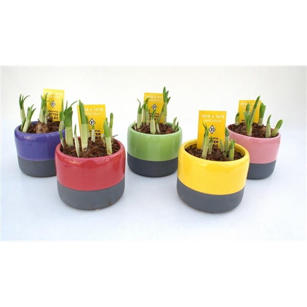 Narcissus Tête a tête in gekleurde keramiek pot. (NT 558)