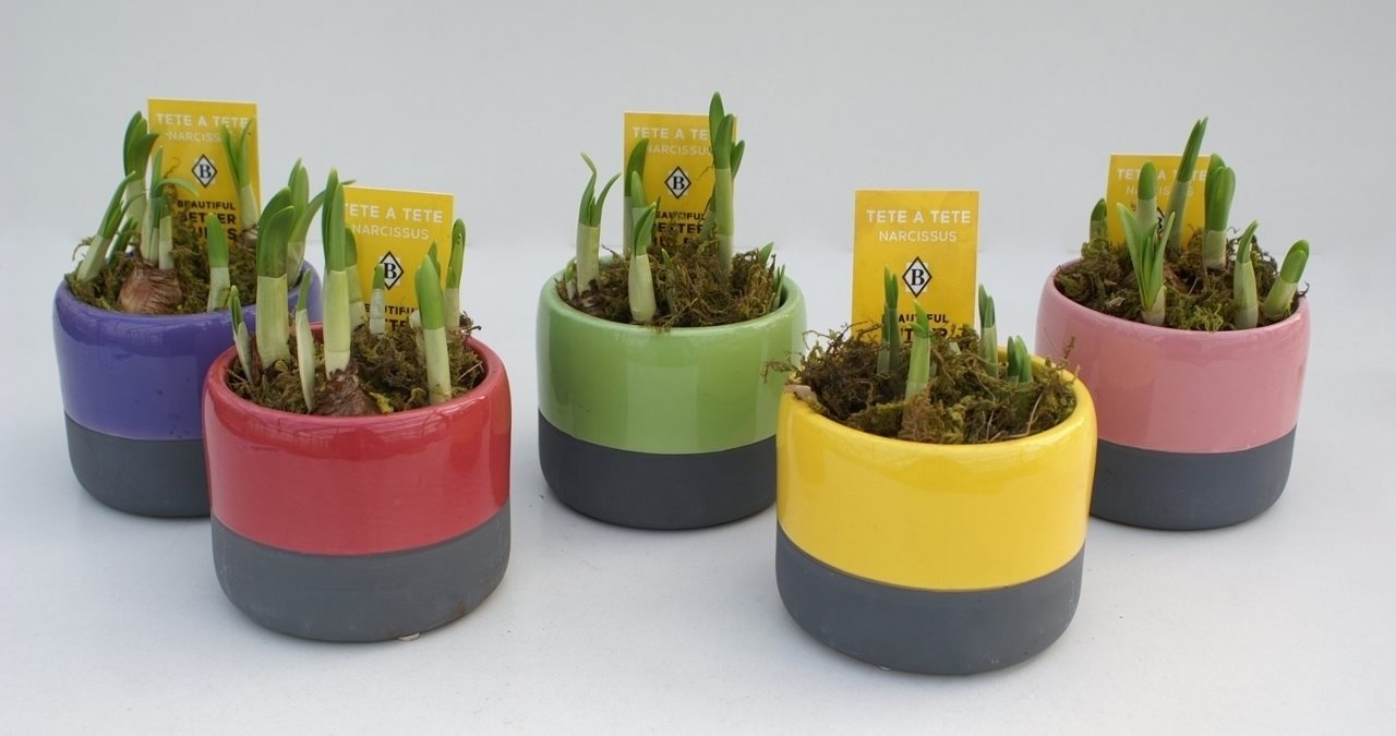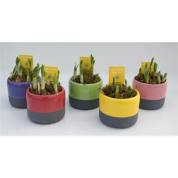 Narcissus Tête a tête in gekleurde keramiek pot opgemaakt met mos. (NTM 558)