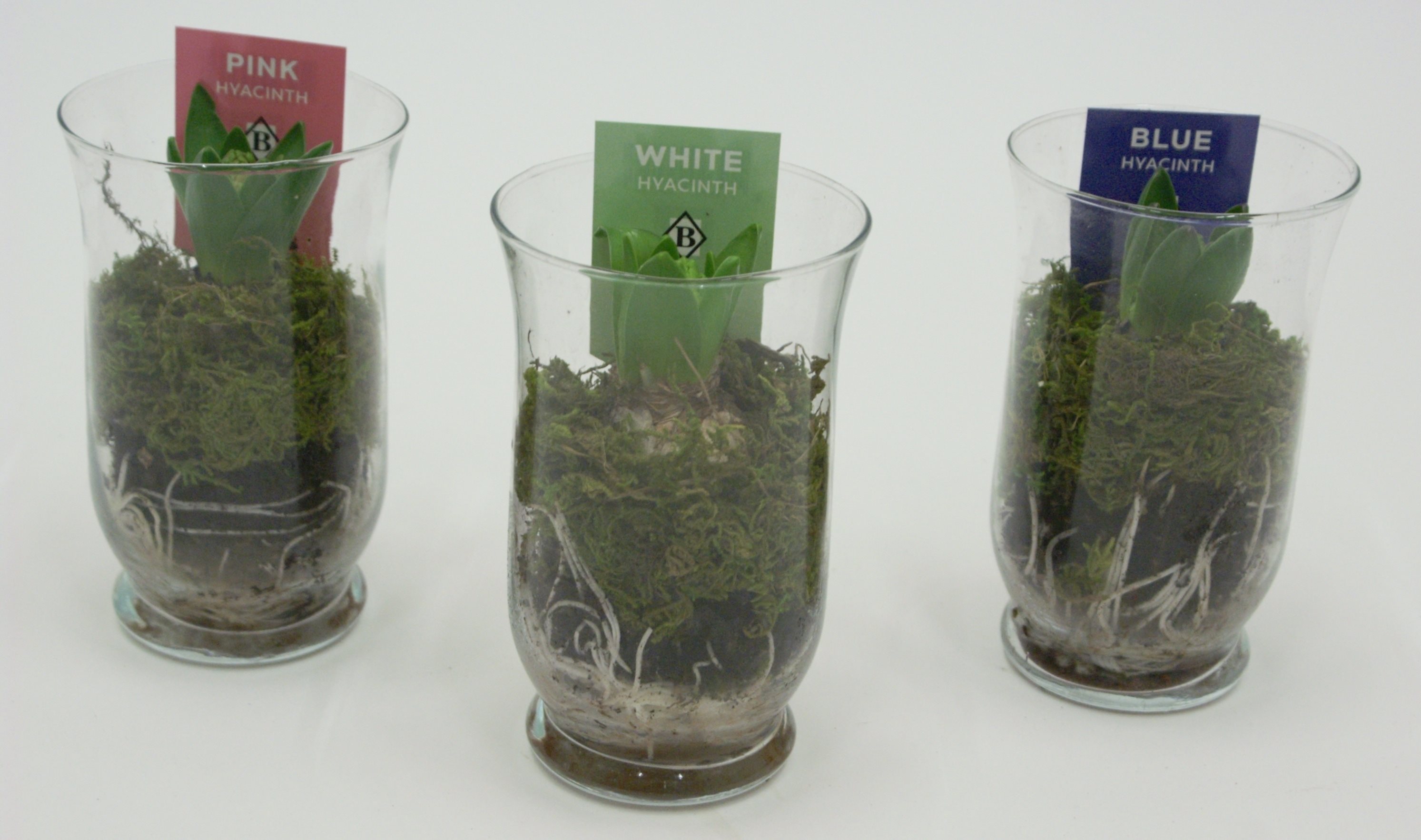 Hyacinthus div. kleuren in windglas opgemaakt met mos (HMM 270)