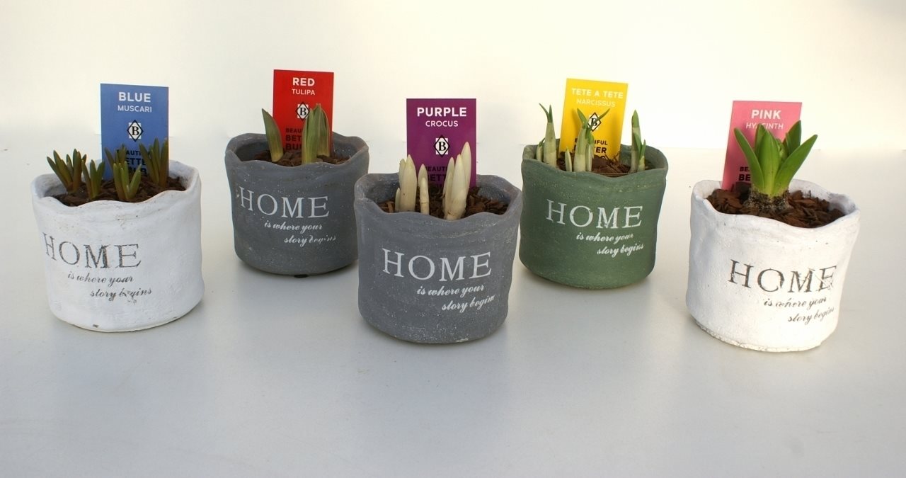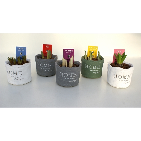 Bolbloemen div. soorten in stenen home deco pot. Kleur: wit, groen en grijs (BM 271)
