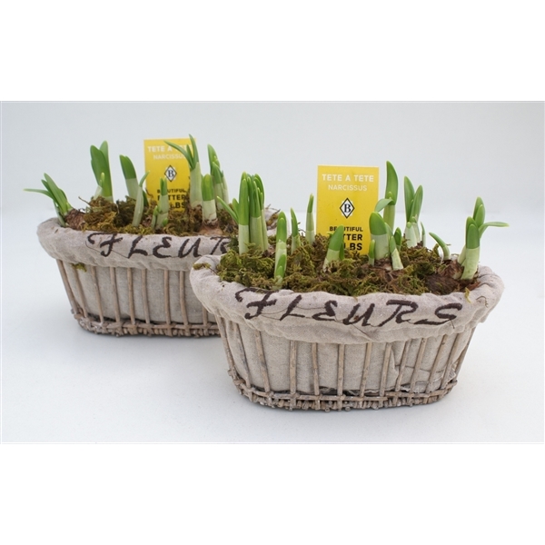 Narcissus Tête a tête in ovaal mand met jute opgemaakt opgemaakt met mos (NTM 260)