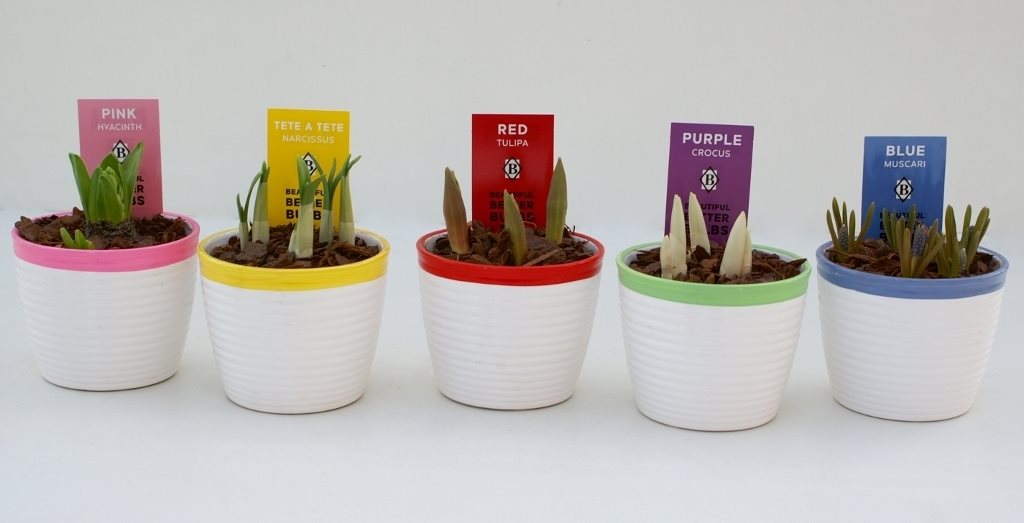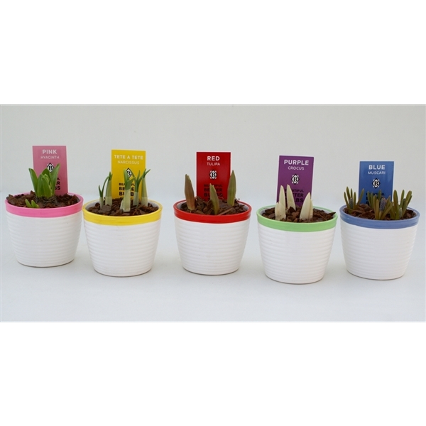 Bolbloemen div. soorten in witte keramieke pot met kleurrand. (BM 754)