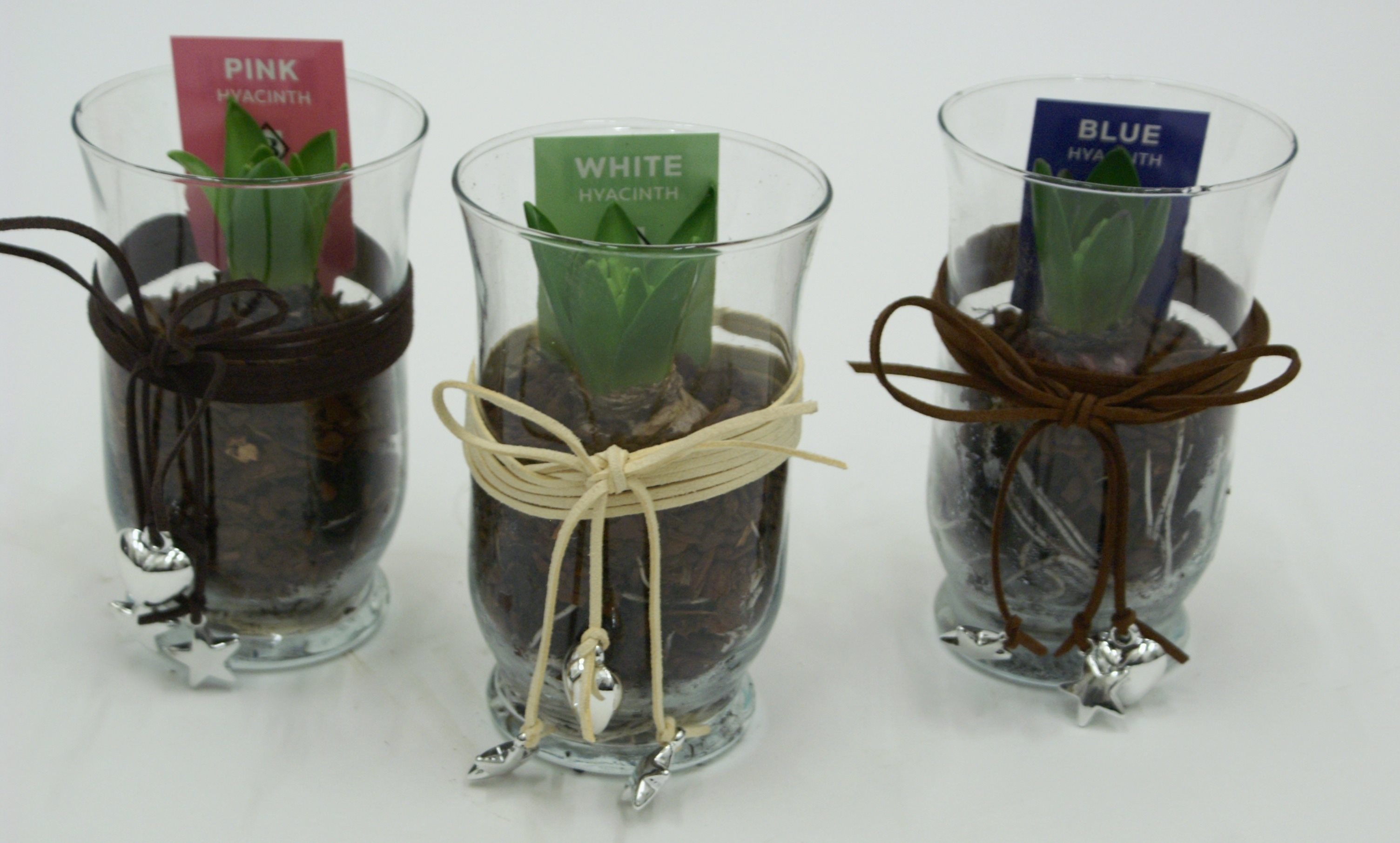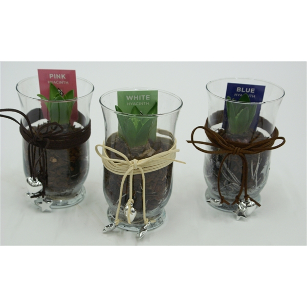 Hyacinthus div. kleuren in windglas met bedeltjes afgestrooid met houtsnippers (HM 470)