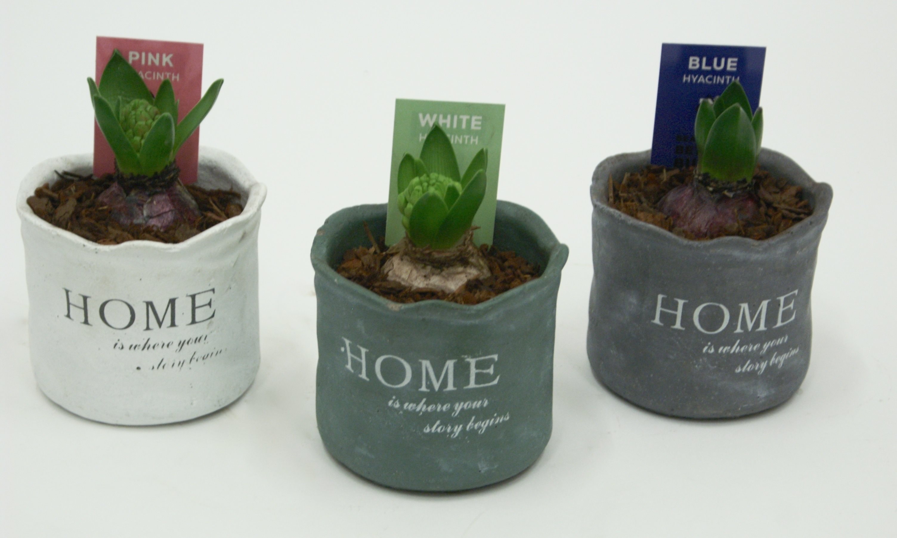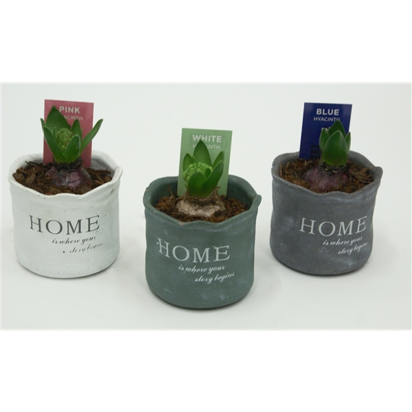 Hyacinthus div. kleuren in stenen home deco pot. Kleur: wit, groen en grijs (HM 271)