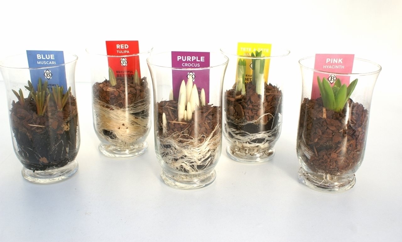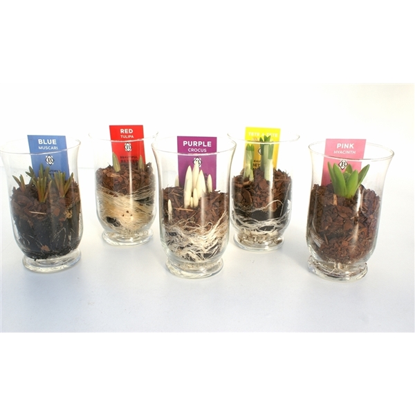 Bolbloemen div. soorten in windglas afgestrooid met houtsnippers (BM 270)