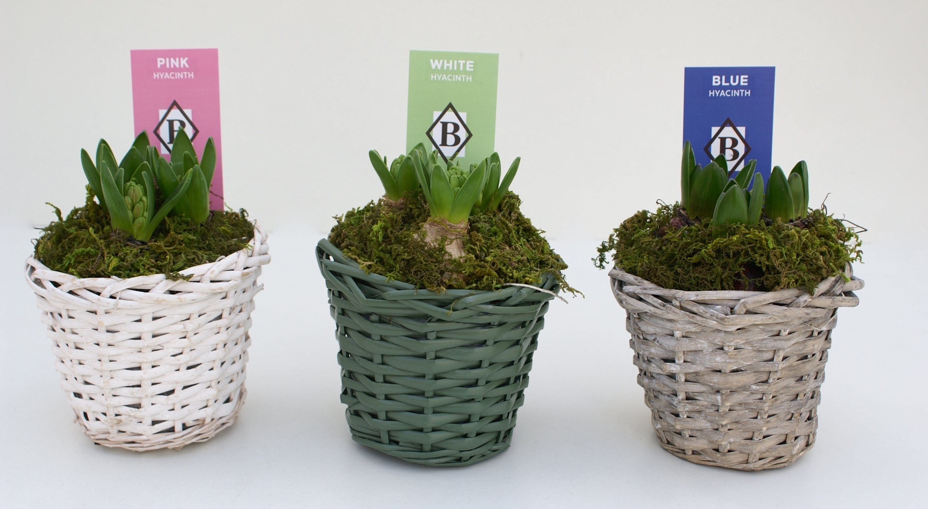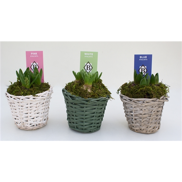 Hyacinthus div. kleuren in rietenmand opgemaakt met mos. Kleur: wit, groen en grijs (HMM 254)