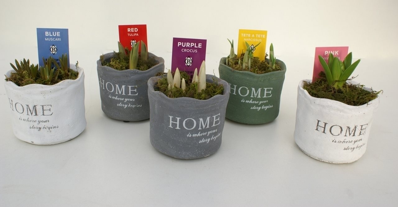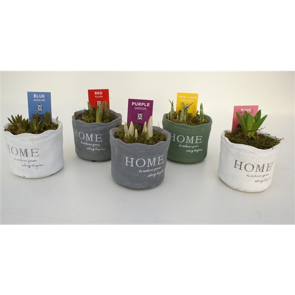 Bolbloemen div. soorten in stenen home deco pot opgemaakt met mos (BMM 271)