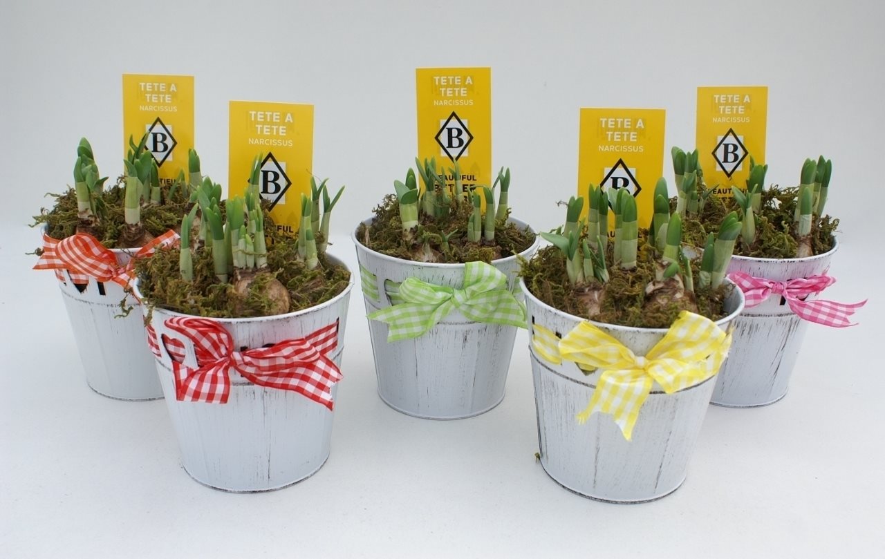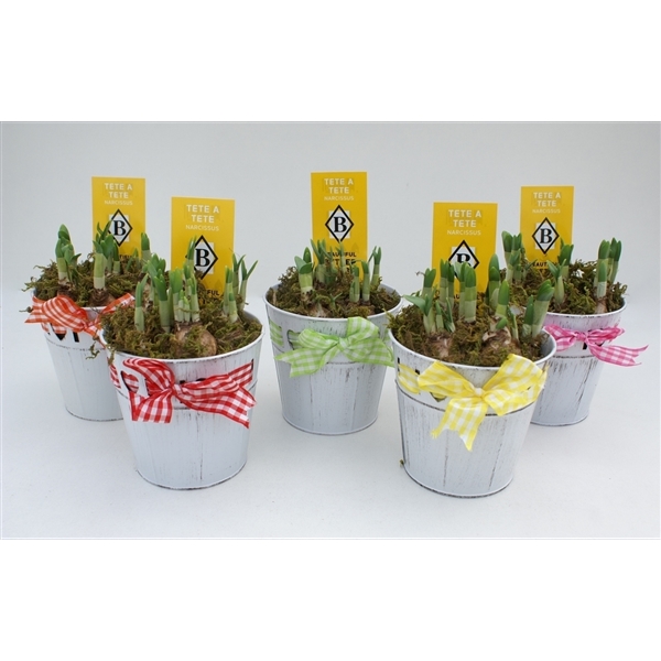 Narcissus Tête a tête in zinken pot met strik opgemaakt met mos (NTM 381)
