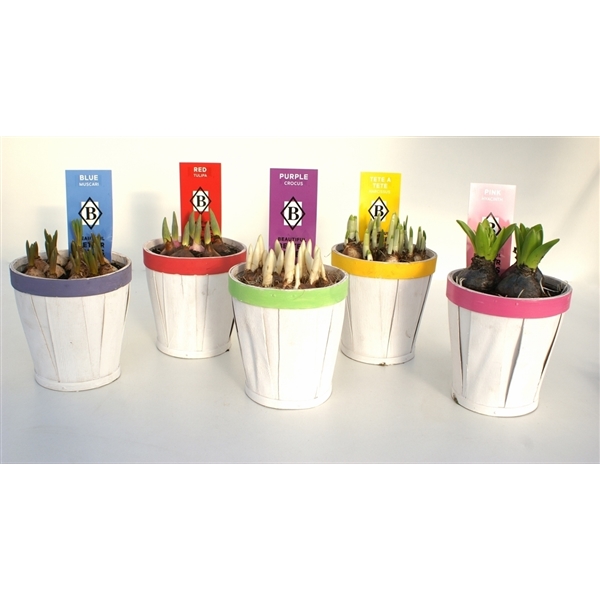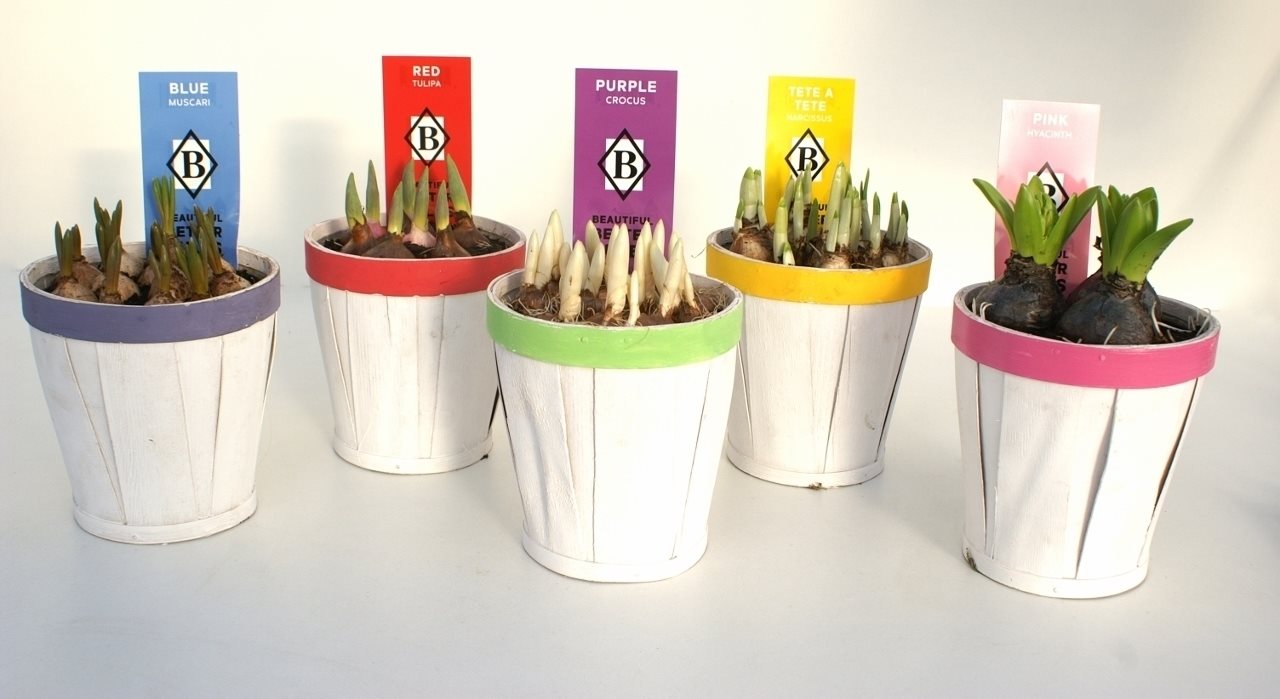 Bolbloemen div. soorten in witte houten pot met kleurrand. (BM 554)