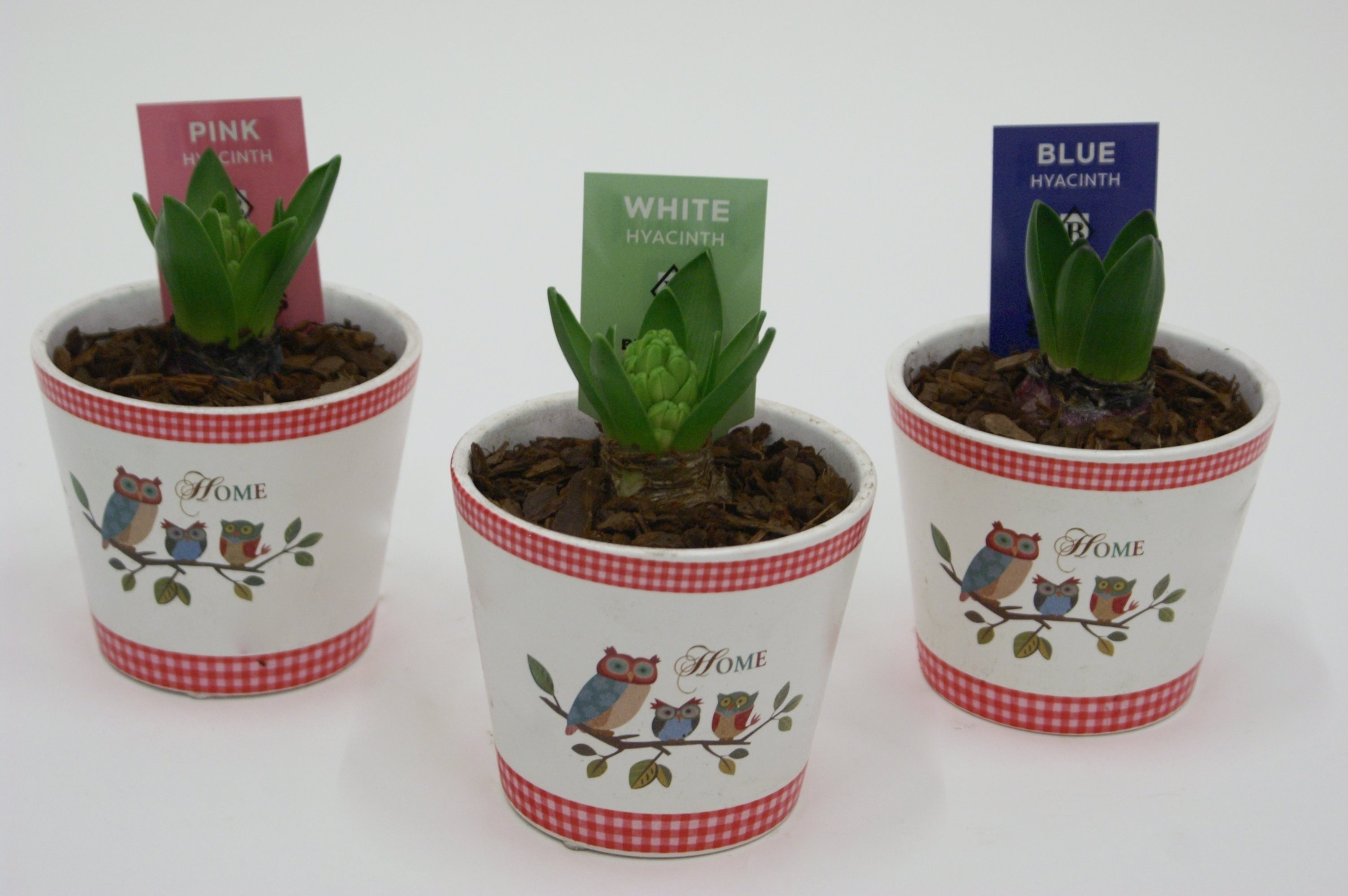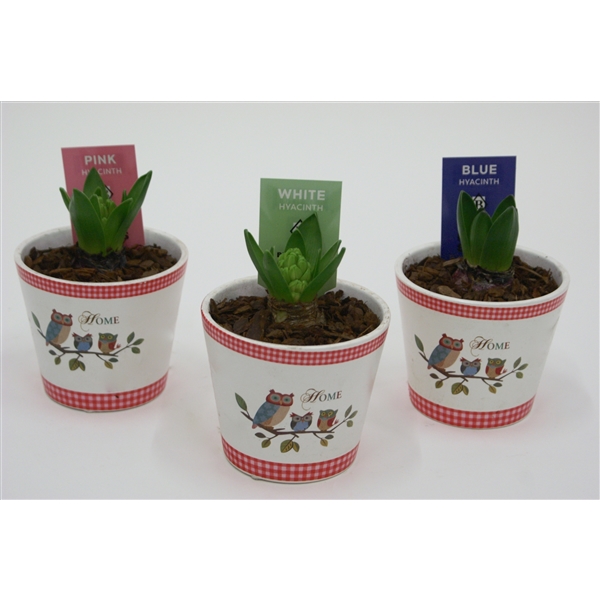 Hyacinthus div. kleuren in keramiek met Uil design (HM 450)