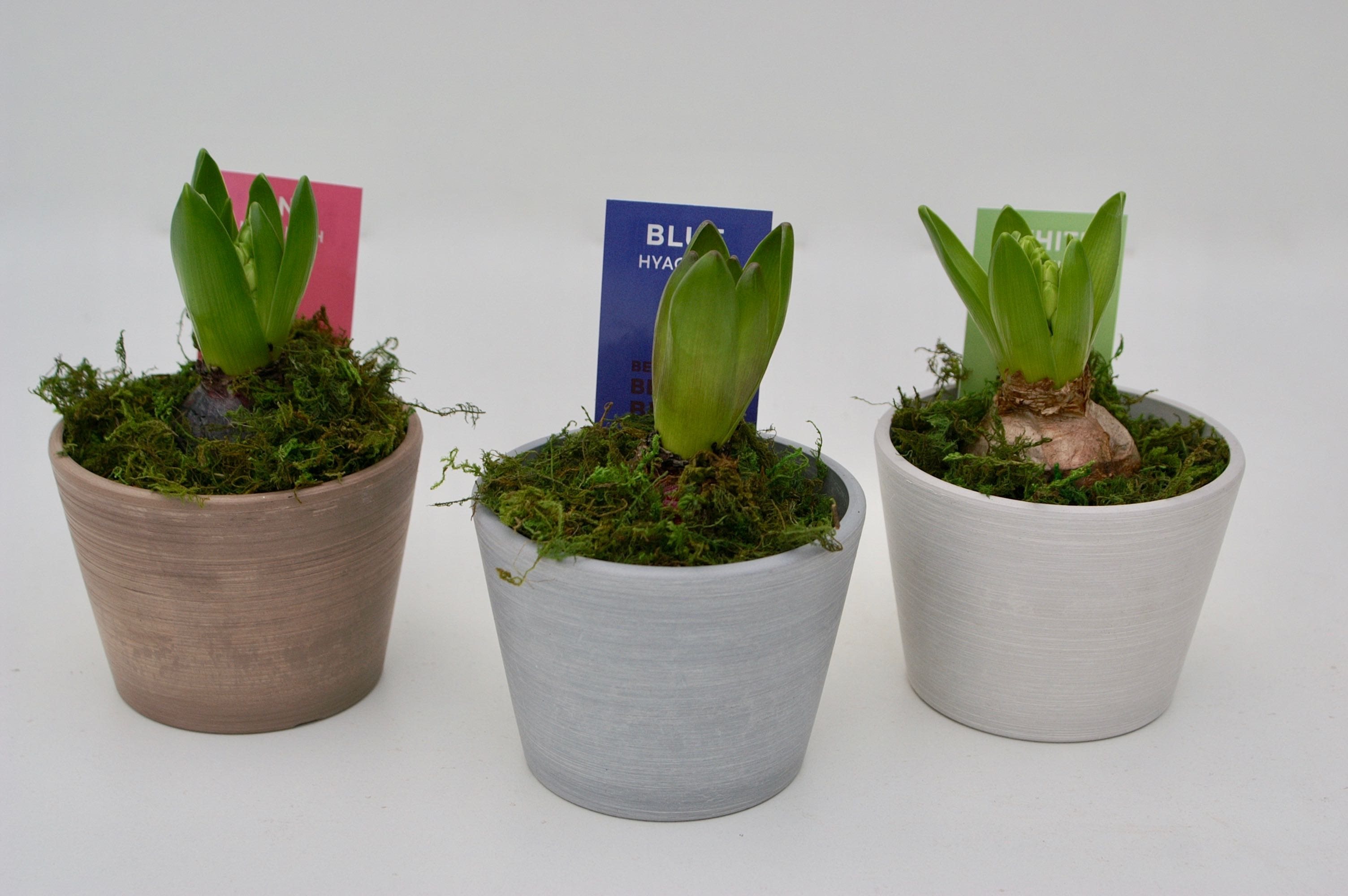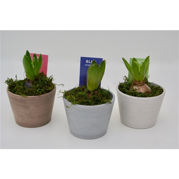 Hyacinthus div. kleuren in stone look pot opgemaakt met mos (HMM 952)