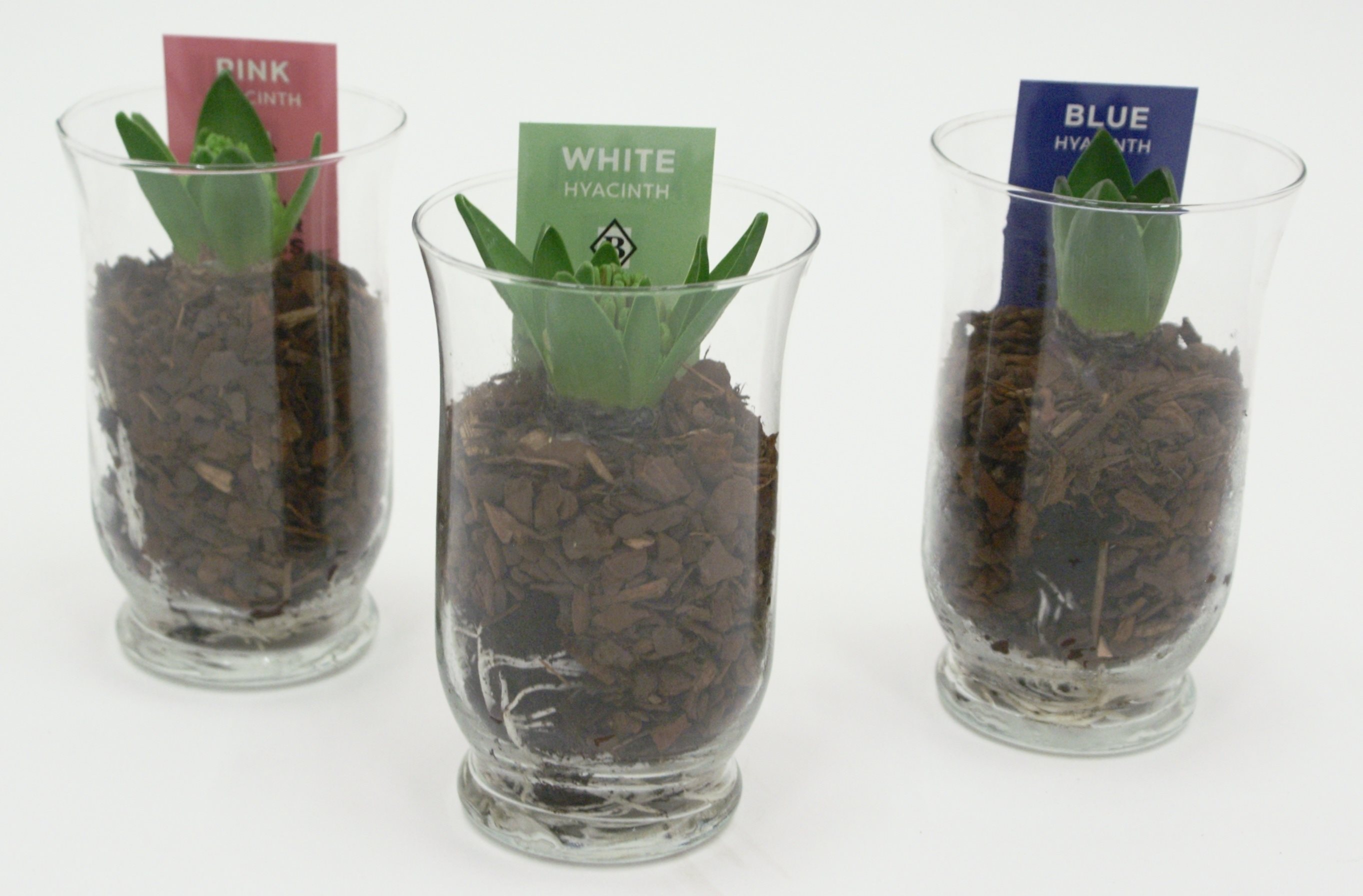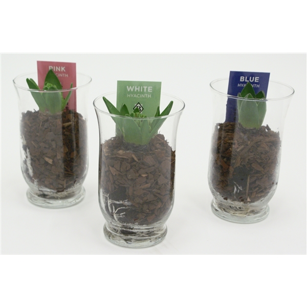 Hyacinthus div. kleuren in windglas afgestrooid met houtsnippers (HM 270)