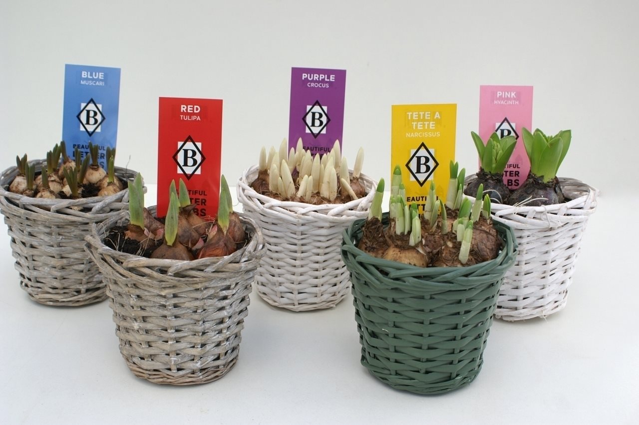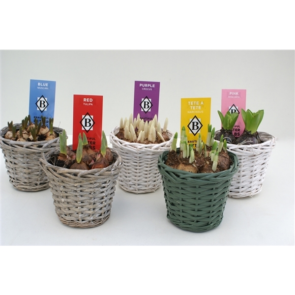 Bolbloemen div. soorten in rietenmand. Kleur: wit, groen en grijs (BM 254)