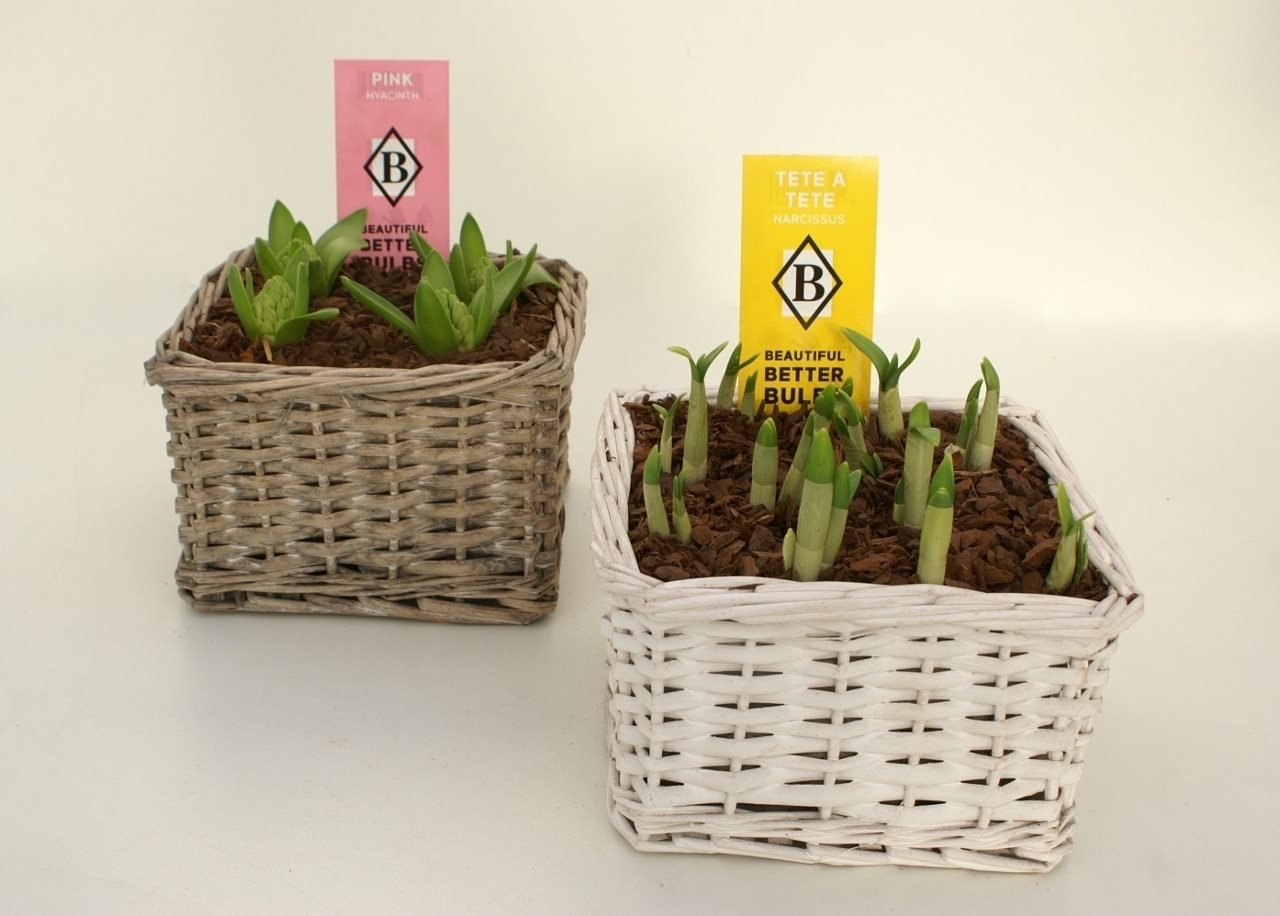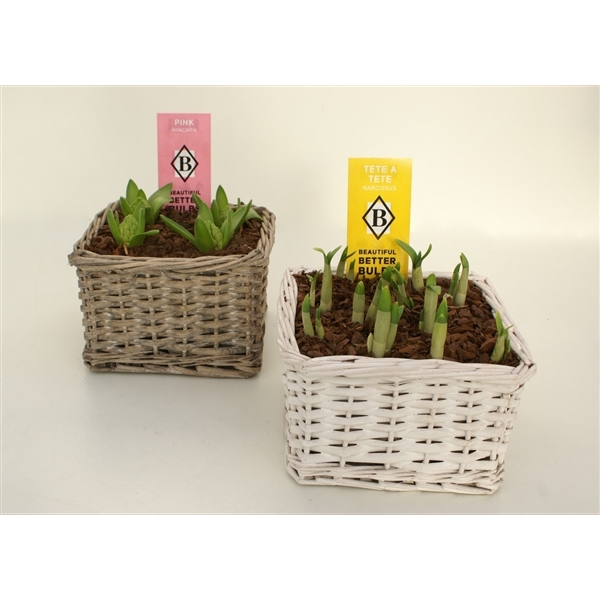 Bolbloemen div. soorten in vierkante mand. Kleur: wit en grijs (BM 259)