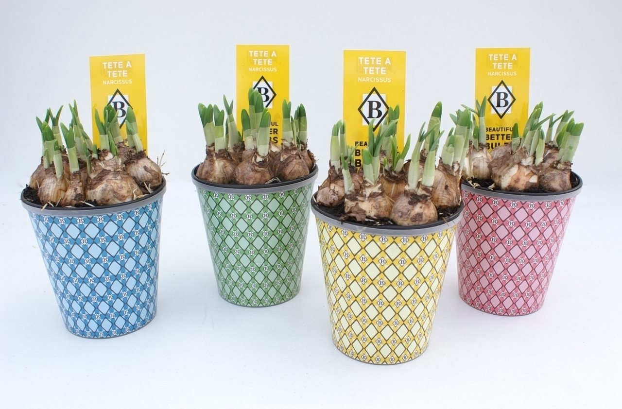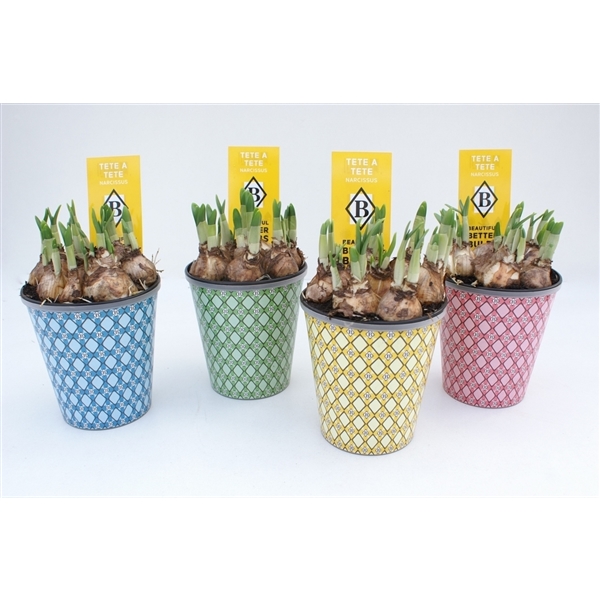 Narcissus Tête a in decoratieve gekleurde ompot. (NT 553)