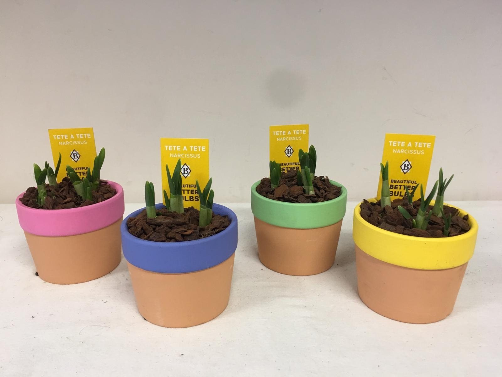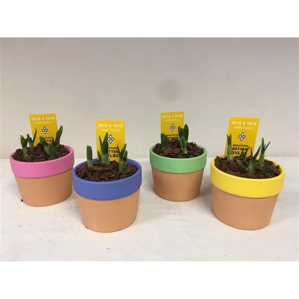 Narcissus Tête a tête in terracotta pot met kleurrand. (NT 955)